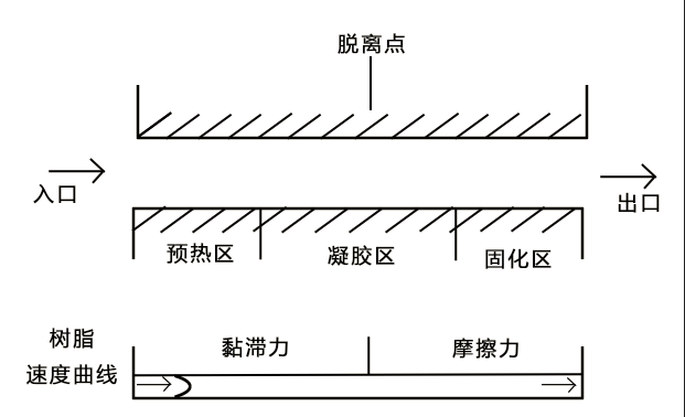 上圖標(biāo)示了材料穿過模具時的主要特征。盡管增強材料以同樣的速度穿過模具,但在某些區(qū)域內(nèi),樹脂和纖維有相對流動。圖中繪出了模具入口和出口附近區(qū)域的樹脂速度分布圖,在模具入口區(qū),樹脂的行為想牛頓流體,壁面速度的邊界條件意味著為零。離模具壁面有一小段距離處,樹脂的流動速度增加到與增強材料相當(dāng)?shù)乃。在模具?nèi)壁表面上,樹脂產(chǎn)生黏滯阻力。
