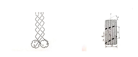 編織物所有的纖維均斜交,與軸線夾角不呈0°與90°。編織原理與編織管套如圖所示。在編織過(guò)程中,纖維的運(yùn)動(dòng)軌跡為螺旋線。選擇合理的纖維角度可調(diào)節(jié)成品管材徑向強(qiáng)度和軸向強(qiáng)度的比例,選擇適宜的纖維排列密度可滿足強(qiáng)度與外觀要求。