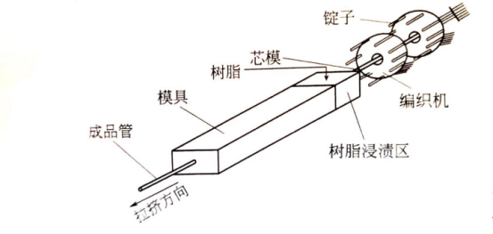 在線編織的坯管由拉擠機(jī)的牽引裝置牽引,芯模固定不動(dòng)。坯管沿芯模織好,有芯模前端進(jìn)圖模具,在模具前端的樹(shù)脂浸漬區(qū)內(nèi)浸漬樹(shù)脂(樹(shù)脂是在壓力下注入模腔),經(jīng)牽引通過(guò)加熱的模具(基體樹(shù)脂在模內(nèi)凝膠、固化),終形成FRP管材成品。
