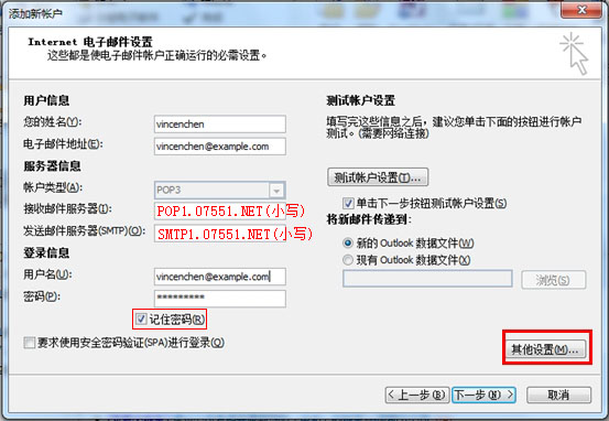 其中,接收郵件服務(wù)器是pop1.07551.net和發(fā)送郵件服務(wù)器smtp1.07551.net。填寫完后,點(diǎn)擊“其他設(shè)置”。